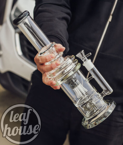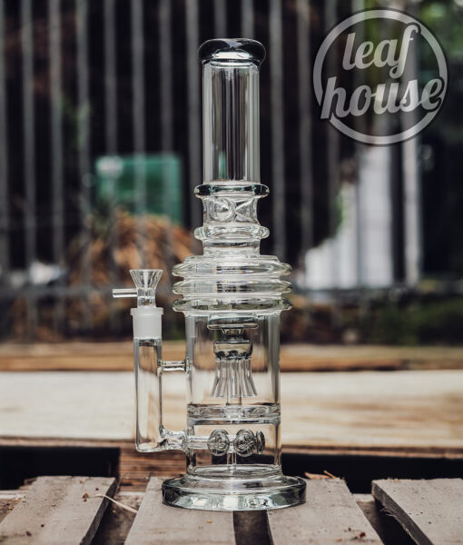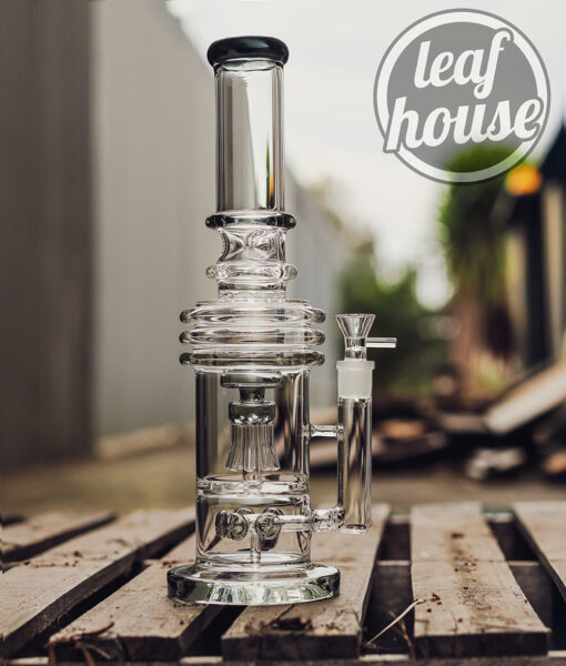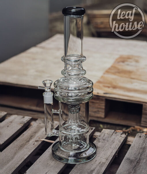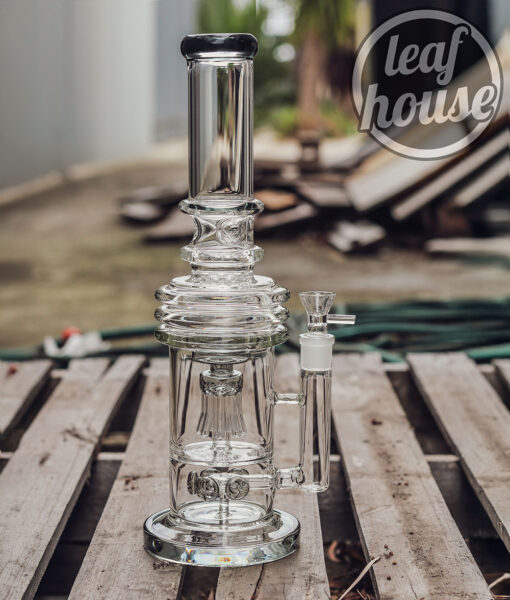 This dual-chamber glass tower is built for enhanced diffusion and structural stability. It combines a unique circular percolator at the base with a flared multi-arm jellyfish-style percolator in the centre chamber. The result is a visually striking and functionally effective system that offers smooth airflow and layered water interaction. Finished with a black-rimmed mouthpiece and made from thick clear glass, this piece also includes an 18 mm male glass bowl with a side handle for secure lifting.