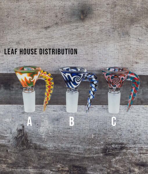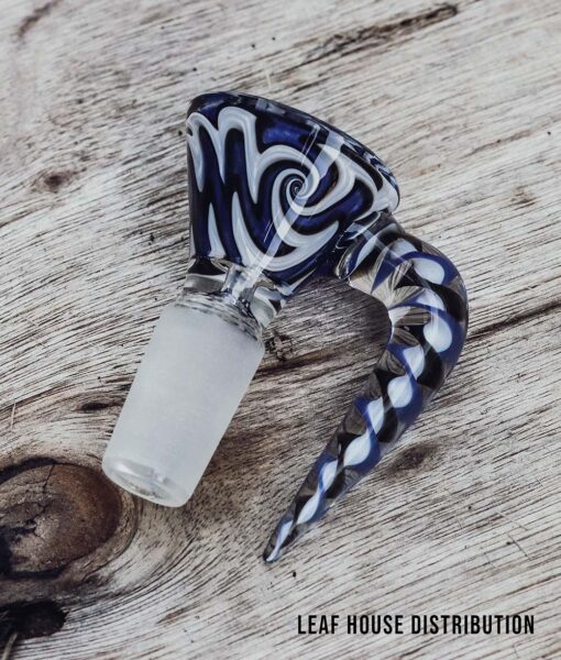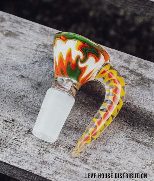 This intricately shaped 14mm glass bowl features a decorative multi-colour pinch swirl design with a curved, horn-style handle. At approximately 5.1 cm in height and 3.2 cm in width across the top, it delivers a bold appearance while remaining compact and functional. Each piece combines flame-worked colour with hand-pulled detailing, offering a vibrant addition to any compatible setup.