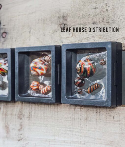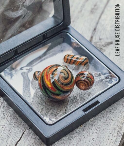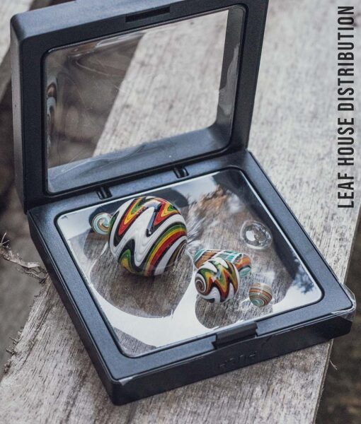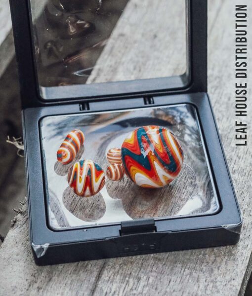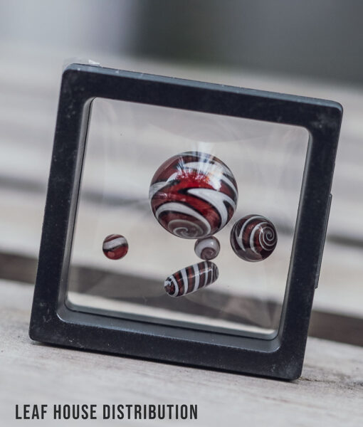 This deluxe set of five handcrafted glass pearls features a dynamic swirl design in vibrant mixed colours. Each set includes a combination of pearl sizes and a cylindrical pillar, presented in a reusable floating display box. Ideal for display or general-purpose configurations where glass pearls of various shapes and sizes are desired.